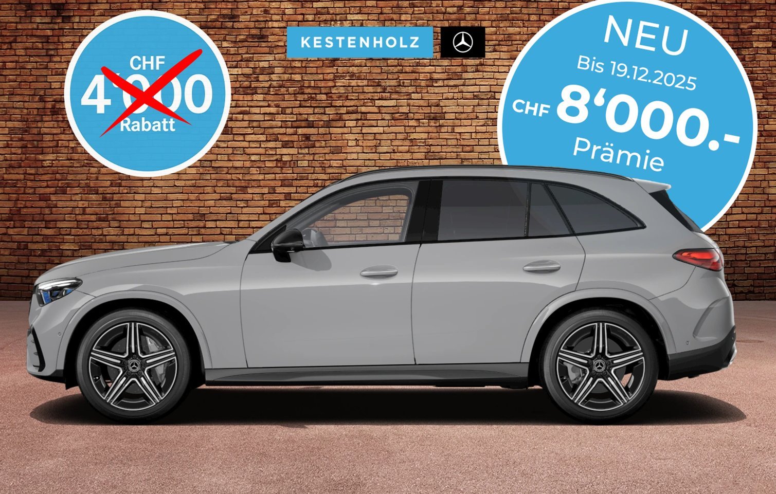 [4] GLC 220 d 4MATIC, 197 + 23 PS (145 + 17 kW), Barkaufpreis: CHF 86 029.– (inkl. CHF 5837.– 4MATIC Prämie und Preisvorteil), 6,7 l/100 km, 152 g CO2/km, Energieeffizienz-Kategorie: F.[1] Abgebildetes Modell: GLC 220 d 4MATIC, 197 + 23 PS (145 + 17 kW), inkl. Sonderausstattungen (AMG Line Premium Plus, Metallic-Lack hightechsilber, 50,8 cm (20") AMG Leichtmetallräder im Vielspeichen-Design, Trittbretter in Aluminium-Optik mit Gumminoppen, Leder schwarz, Fahrassistenz-Paket Plus), Barkaufpreis: CHF 86 029.– (inkl. CHF 5837.– 4MATIC Prämie und Preisvorteil), 5,5 l/100 km, 144 g CO2/km, CO2-Emissionen aus Treibstoff- und/oder Strombereitstellung: 24 g/km, Energieeffizienz-Kategorie: E.[1] Angebot gültig bis 30.11.2025 für sofort verfügbare PW-Lagerfahrzeuge (ausgeschlossene Modelle: G-Klasse, V-Klasse, T-Klasse, EQT, EQV, CLA (C174/C178) und Mercedes-Maybach). Unverbindliche Preisempfehlung. Änderungen vorbehalten.
