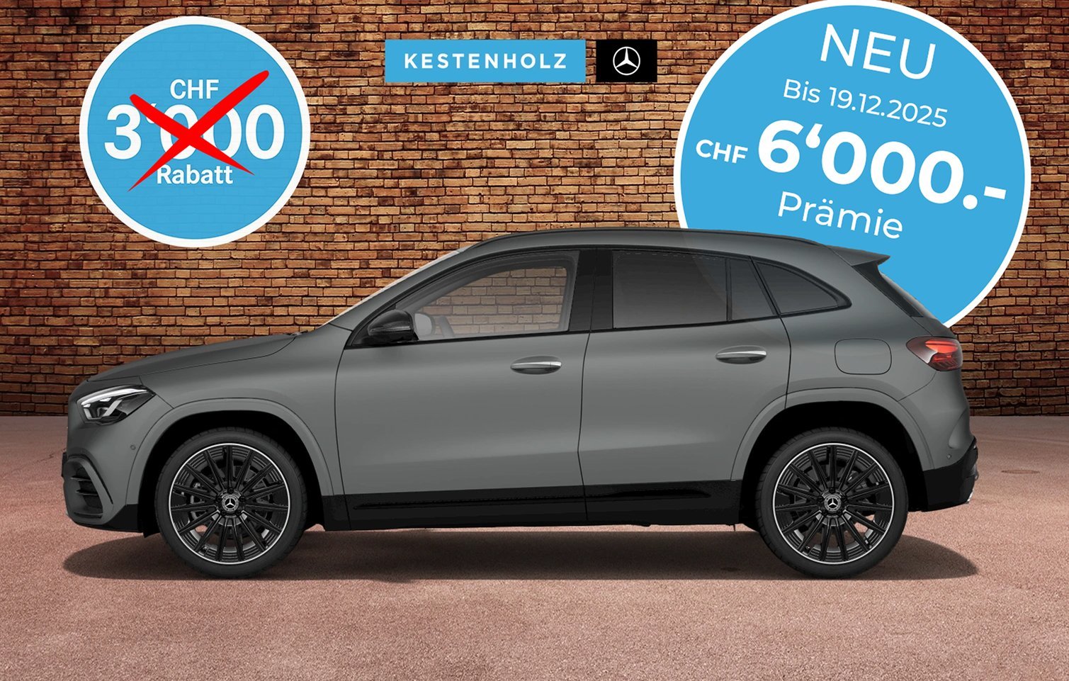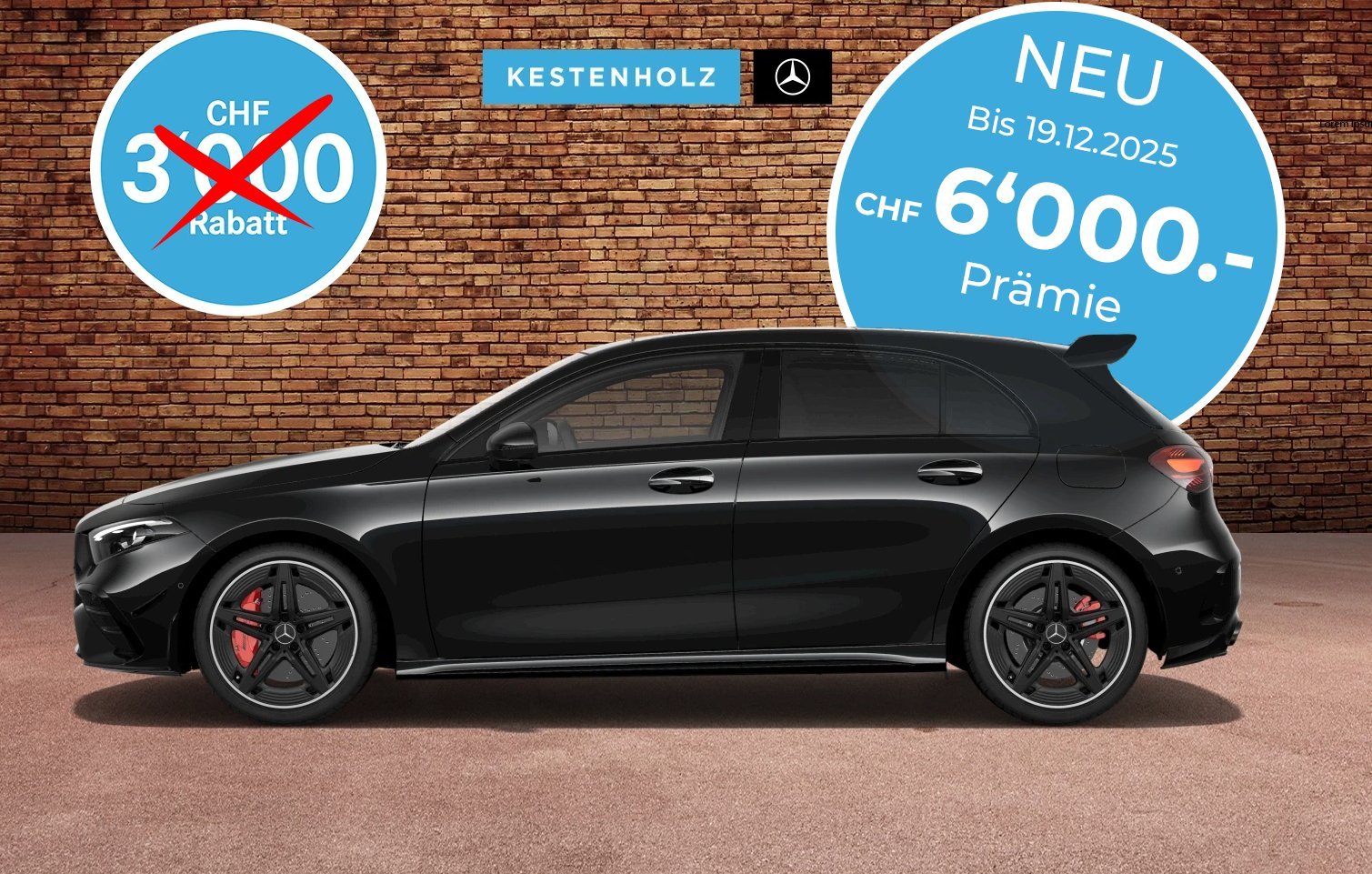 [3] A 220 4MATIC Kompaktlimousine, 190 + 14 PS (140 + 10 kW), Barkaufpreis: CHF 46 882.– (inkl. CHF 4018.– 4MATIC Prämie und Preisvorteil), 6,7 l/100 km, 152 g CO2/km, Energieeffizienz-Kategorie: F.[1] Abgebildetes Modell: A 220 4MATIC Kompaktlimousine, 190 + 14 PS (140 + 10 kW), inkl. Sonderausstattungen (Special Edition, MULTIBEAM LED), Barkaufpreis: CHF 53 386.– (inkl. CHF 4150.– 4MATIC Prämie und Preisvorteil), 7,1 l/100 km, 161 g CO2/km, Energieeffizienz-Kategorie: F.[1] Angebot gültig bis 30.11.2025 für sofort verfügbare PW-Lagerfahrzeuge (ausgeschlossene Modelle: G-Klasse, V-Klasse, T-Klasse, EQT, EQV, CLA (C174/C178) und Mercedes-Maybach). Unverbindliche Preisempfehlung. Änderungen vorbehalten.