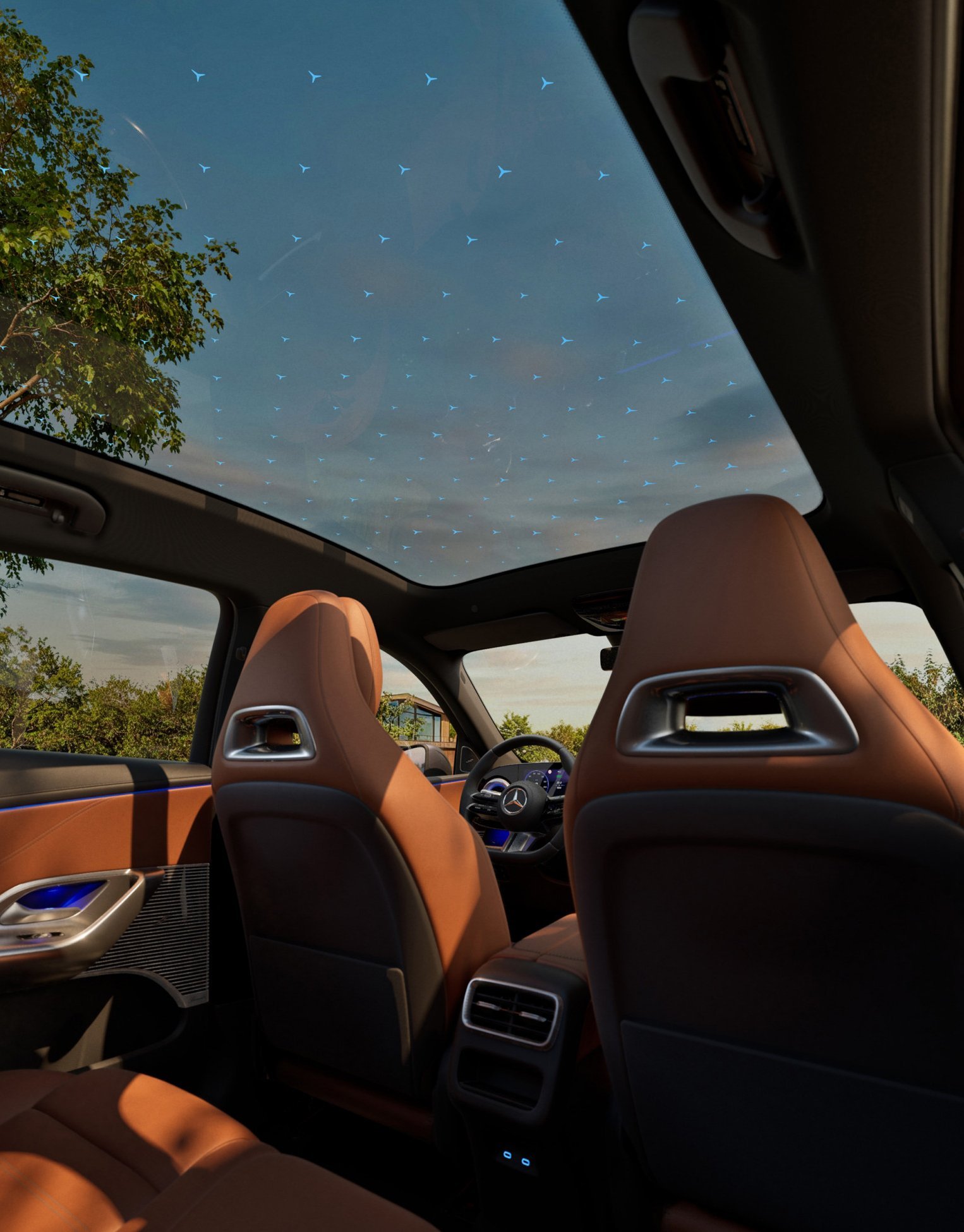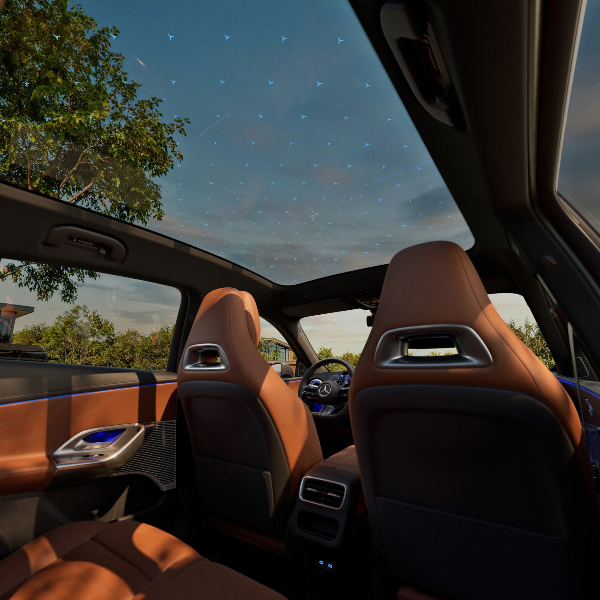 Das optionale SKY CONTROL Panoramadach mit beleuchtetem Sternenmuster verwandelt jede Nachtfahrt in ein