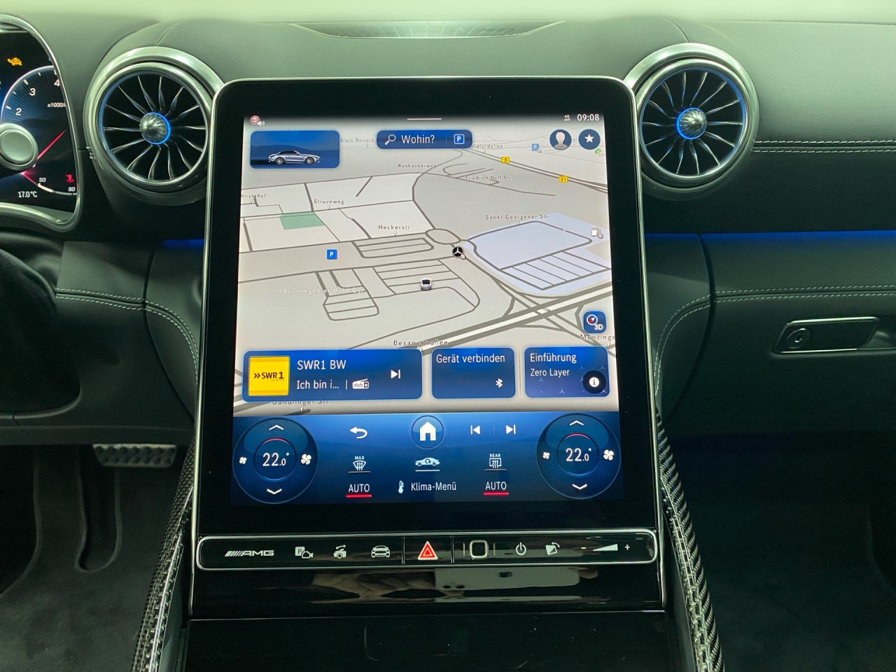 Interieur: Sitze Leder Leder Nappa schwarz, Innenfarbe schwarz, Multifunktions-Sport-/Lederlenkrad, Lenkradheizung, Bordcomputer, Dekoreinlagen: H73 AMG Zierelemente Carbon, Lenkrad-Schaltwippen